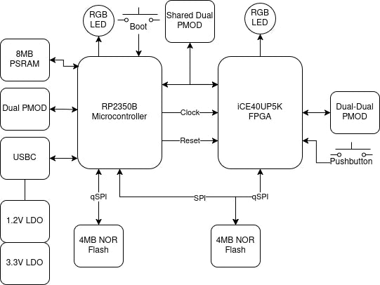 This microcontroller development board features independent flash for the FPGA and RP2350B, low power SSRAM, a couple of pushbuttons and a couple of 3 color LED's with all FPGA and RP2350 pins brought out to easy to use 0.1" header pins (arranged as Pmod's) for fast prototyping.