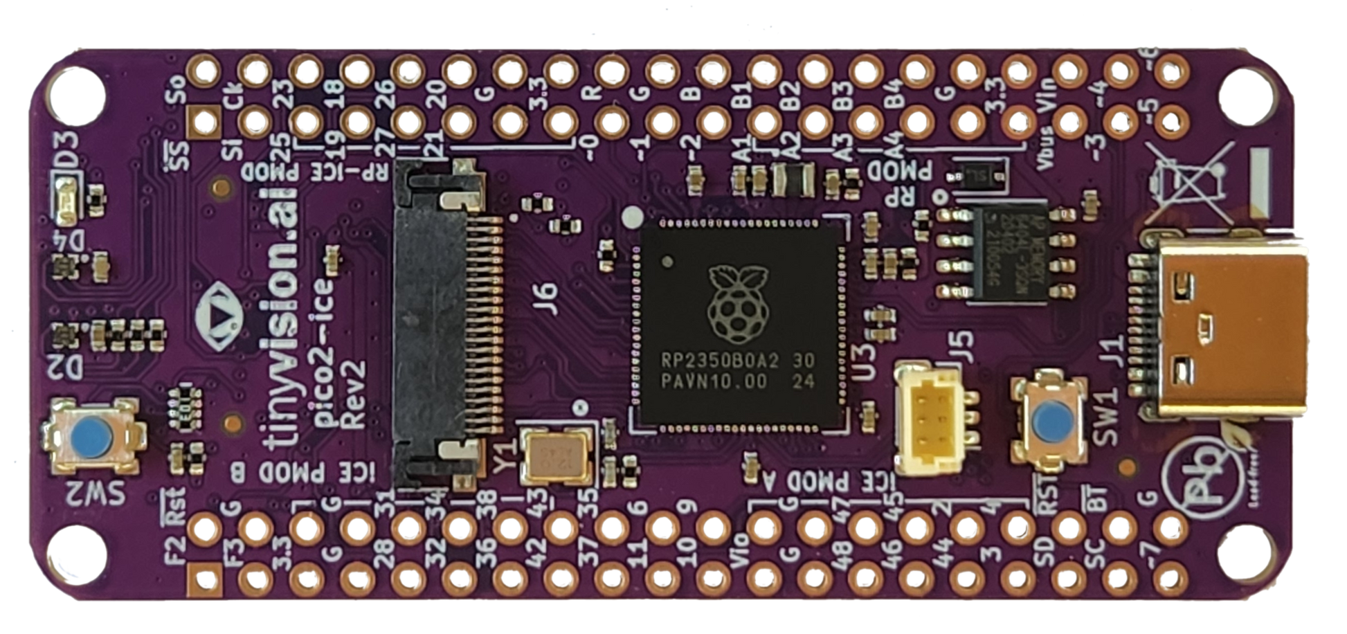 - 2 pushbuttons, 1 for RP2350 boot mode that can also be used for other functions, and one for the FPGA